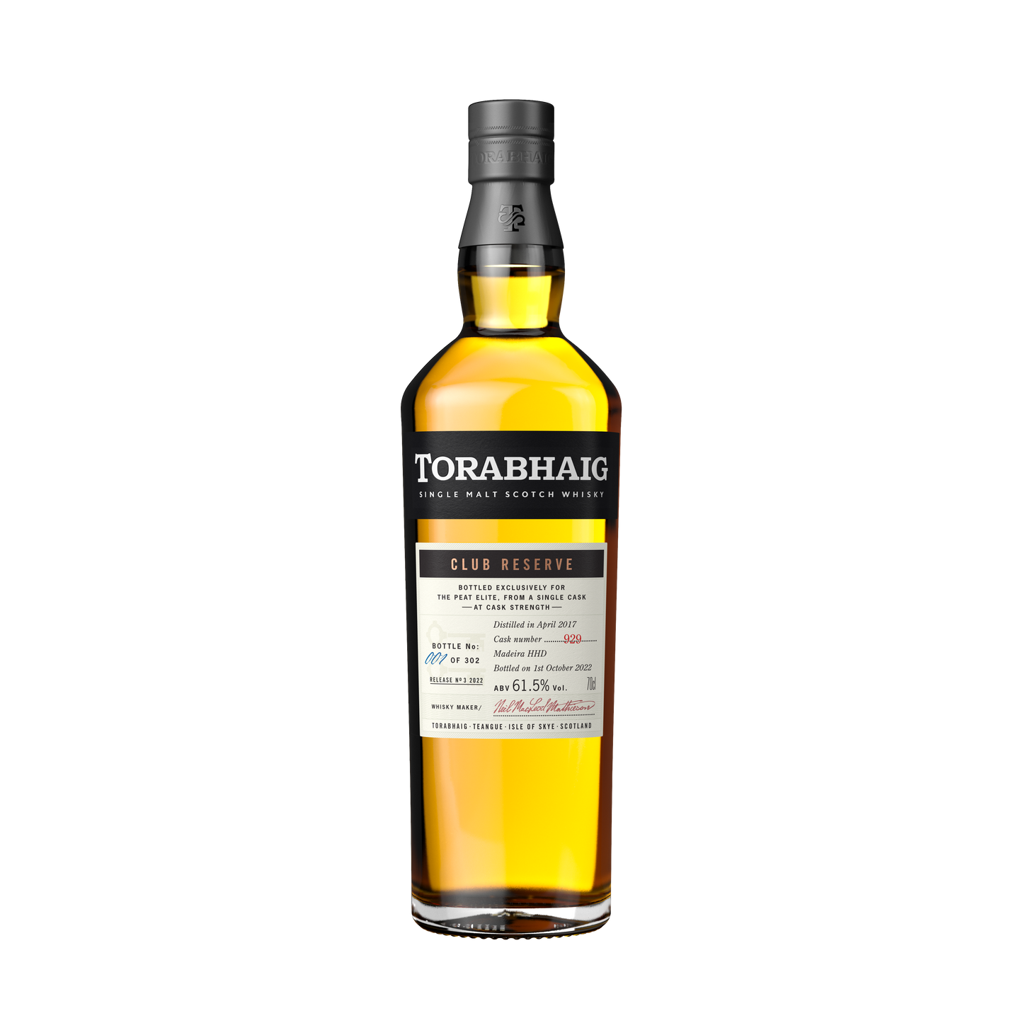 This exclusive release in the Club Reserve series was distilled in 2017 and matured for 5 years in American Standard Barrels, followed by a 6-month finish in Madeira Hogsheads. Bottled at cask strength with no chill filtration or added coloring, this limited edition whisky showcases the rich interplay between Torabhaig’s signature peat smoke and the sweet, fruity influence of the Madeira casks. It is a rare and sought-after expression, offering a unique exploration of our island spirit.